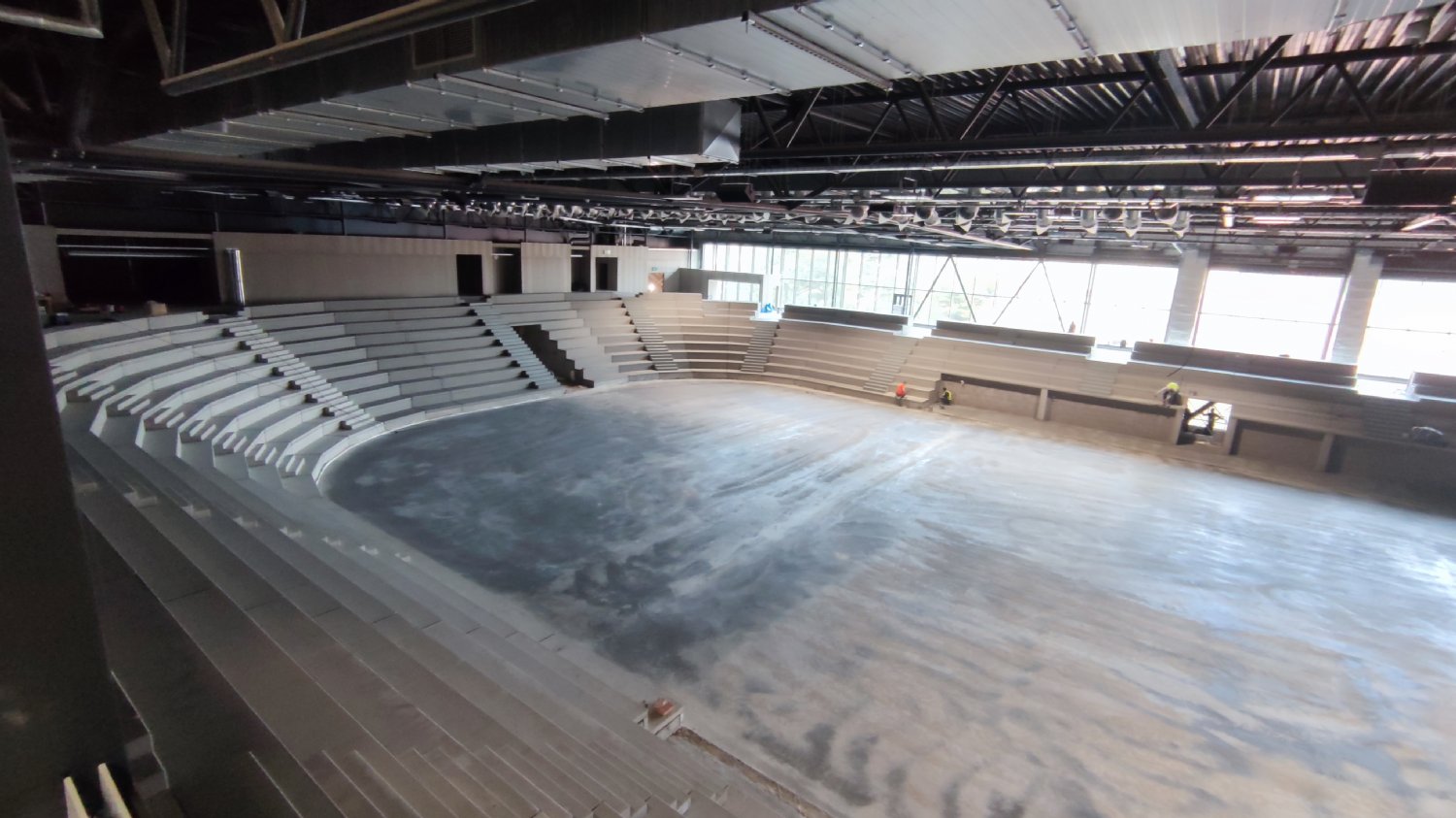 Na chodbách už je v provozu osvětlení, zapojena jsou protipožární čidla. To malé sklíčko to je orientační systém. Na něm budou zobrazeny různé světelné symboly usnadňující pohyb po stadionu
