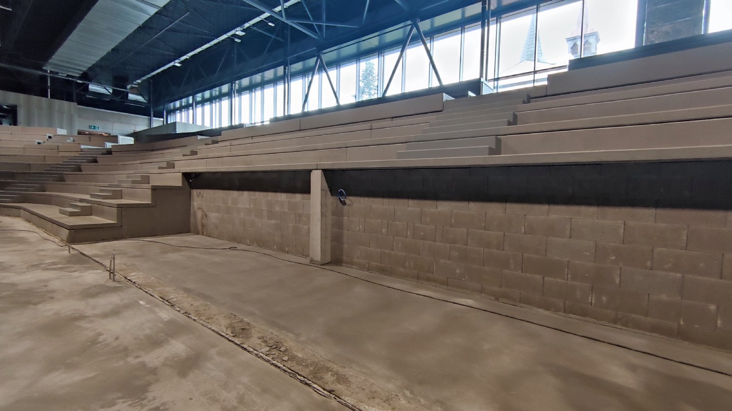 Detailní pohled na jednu z lišt, která bude brzy namontována a také na nové schodiště, které propojí dolní i horní vstupy na stadion