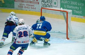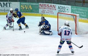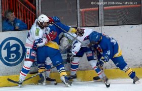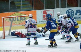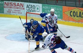 Horácká Slavia měla již v první minutě výhodu přesilové hry . Tuto přesilovku se jako jednu z mála podařilo hokejistům z Třebíče využít. Po střele Adama Pometla překonal hostujícího brankáře Tomáš Vondráček- 1:0. Poté jsme měli možnost shlédnout hru čtyři na čtyři. Žádná velká šance se však při zmenšeném počtu hráčů na ledě neurodila. Nejen úvodní část zápasu nabízela málo šancí na obou stranách. Hostům se v 10. minutě podařilo vyrovnat. První střelu Jakuba Šlehaře domácí gólman sice vyrazil pravým betonem, ale na druhý střelecký pokus tohoto hráče pod víko už byl domácí brankář krátký- 1:1. Ve 12. minutě se činila domácí obrana, když zastavila přečíslení z protiútoku a tím zabránila ohrožení domácí klece. O minutu později zkoušel pozornost hostujícího brankáře od modré Martin Sobotka. Hostující brankář si však z touto střelou dokázal poradit. Hosté dokázali do první přestávky obrátit skóre na svoji stranu. V 16. minutě po chybě domácího obránce skóroval po přihrávce Křemečka do odkryté klece Antonín Honejsek- 1:2.Ze druhé třetiny bylo odehráno tři a půl minuty a kotouč se opět objevil za zády domácího brankáře. Vydařenou střelou od modré čáry se trefil v oslabení hostující Křemeček- 1:3 . Domácí byli inkasovanou brankou v přesilové hře viditelně zaskočeni. Šanci na vstřelení branky dostala Horácká Slavia ve 31. minutě, kdy hrála přesilovou hru 5 na 3. Třebíčští však s touto přesilovkou příliš dobře nenaložili a ještě si způsobili komplikace, protože když se z trestné lavice vracel druhý potrestaný hráč dostal pěknou přihrávku do brejku, který naštěstí pro domácí neproměnil. Třebíčští na vlastní kůži pocítili přísloví nedáš - dostaneš. Ve 33. minutě prostřelil domácího brankáře Martin Jurásek- 1:4. Netrvalo dlouho a hosté zvýšili již na 1:5. Branku si připsal opět hostující Jurásek. Po této inkasované brance přenechal Leoš Mikulka místo v brance Adamu Wolfovi. . Ve 38. minutě však Třebíč snížila. Po skrumáži před hostující brankou skóroval domácí Adam Pometlo - 2:5.