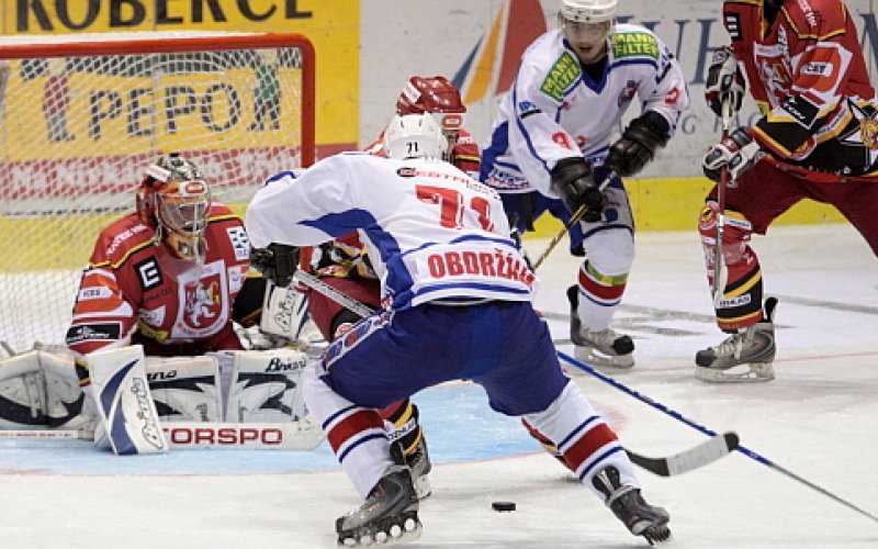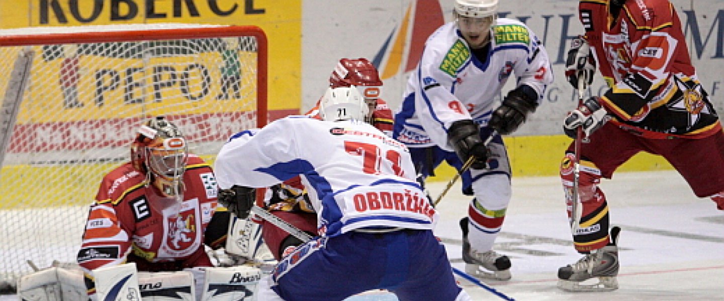 První dvacetiminutovka utkání mezi Hradcem Králové a Třebíčí příliš hokejové krásy nepřinesla. Již od začátku bylo vidět, že oba týmy chtějí hrát opatrný hokej, a tak jsme žádnou vyloženou gólovou šanci neviděli. Třebíčští byli na začátku zápasu přece jen více aktivnější. Jmenovitě se o rozruch v hradeckých řadách zasloužil Petr Obdržálek, když z dobré střelecké pozice ohrozil Filipa Luňáka. O chvíli později ovšem přišel faul Michala Kempného a ke slovu se dostal i Hradec. Nedalo se však říci, že by početní výhoda domácí tým nastartovala. Oba týmy v první třetině sváděly spíše boj o střední pásmo, chvílemi i o každý kousek ledu. Za zmínku stojí akce dva na jednoho v podání Víta Budínského a Martina Koudelky. Ta ze začátku vypadala velmi nebezpečně, druhý jmenovaný hradecký útočník ale nezpracoval prudkou přihrávku svého spoluhráče a brankář Lev tak ani zasahovat nemusel. Ve 13. minutě si za protesty směrem k hlavnímu rozhodčímu vysloužil osobní desetiminutový trest Jan Káňa. Po tomto vyloučení jsme byli svědky už jen jednoho přečíslení, které vyřešil Šimon Macháň střelou. Jakub Lev si s ní ale poradil a do kabin se tak odcházelo za stavu 0:0.Hned v úvodu druhého dějství byl vyloučen Lukáš Sláma a za své provinění zaplatil daň nejvyšší. Hradečtí totiž v následné přesilové hře sehráli pohlednou akci na jeden dotek, na jejímž konci byl Martin Koudelka a otevřel tak skóre zápasu. Po inkasované brance jakoby Třebíčští chtěli rychle vyrovnat. Střelecké pokusy Slámy, Zahradníka a Ostřížka ale Luňák zlikvidoval. Ve 29. minutě se hradečtí hokejisté radovali podruhé. Jaromír Florian předložil kotouč Janu Bergerovi, který střelou bez přípravy překonal Jakuba Lva. O sedm minut později už domácí vedli o tři branky. Střelu Jana Hrušky totiž do hostující klece dorazil Jiří Kadlec. Hned v dalším střídání mohl hradecké vedení navýšit Martin Koudelka, ale v samostatném úniku ho zradila koncovka.