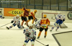 Jubilejní 50. kolo první ligy přivedlo na led jihlavské Dukly velkého rivala z Vysočiny Horáckou Slavii Třebíč. Jihlava doma naposledy podlehla právě Třebíči, a tak měla dnes soupeři co vracet. Domácím se povedl skvělý vstup do utkání, hned první střídání dokázali jihlavští hokejisté proměnit v gól. Skvělou práci odvedl urostlý Jonáš Fiedler, který se dobře natlačil před branku, ale jeho pokus Šindelář kryl. Vzápětí se však bleskově do branky vrhnul jihlavský kapitán Oldřich Bakus, 1:0 a nechytatelnou střelou pod víko dal první branku zápasu. Hosté však v 11. minutě dokázali vyrovnat. Do pásma Dukly zavezl kotouč Jiří Oliva, zblokovaný puk se pak odrazil na hůl volného Lukáše Květoně, 1:1, jenž švihem prostřelil Suchanovy betony. Do další šance přihrál Otu Lazorišákovi Ladislav Rytnauer, ale puk se štěstím ukryl brankář Třebíče. Hostům se hned z brejku povedlo vstřelit vedoucí branku. Jiří Oliva poslal touš na hůl spoluhráče Lukáše Květoně, 1:2, a ten jej poslal do odkryté klece domácích. Po první třetině odcházeli do kabin spokojenější hosté.Jihlavané opět skvěle zvládli vstup do třetiny. Roman Hlouch, 2:2 nejprve vyslal do úniku Milana Baranyka, který před Filipem Šindelářem kotouč vrátil a i když se zdálo, že jihlavský útočník střílel pouze do betonu, kotouč nakonec pod chráničem třebíčského gólmana proklouzl až za brankovou čáru. Ve druhé části hry se velmi přitvrdilo a rozhodčí trochu přestal hru zvládat. Velké váhání hlavního rozhodčího Dvořáka, při vyhodnocování některých akcí, vyvolávalo na ledě velmi nepřátelskou náladu a hráči se často dopouštěli až zákeřných zákroků. Ve 26. minutě se hosté dostali do přečíslení, ale chybu v obraně napravil perfektním zákrokem jihlavský gólman Jaroslav Suchan. Ve 29. minutě třebíčský Květoň, který dal v zápase dvě branky Třebíče, zařval cosi směrem k hlavnímu sudímu Dvořákovi a posléze do něj dokonce vrazil. Rozhodčí mu udělil trest do konce utkání. Domácí se ujali vedení ve 36. minutě. Po zblokované střele domácích se k touši dostal Michal Giba, postrčil jej Danielu Hodkovi, 3:2, a ten tvrdou střelou potěšil domácí příznivce.