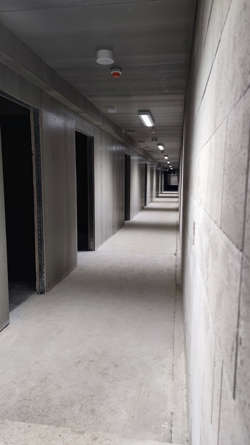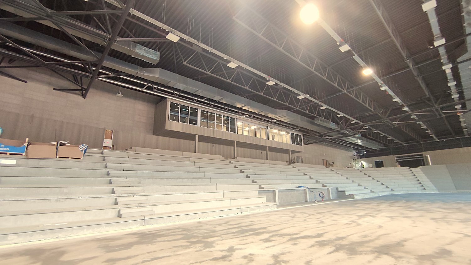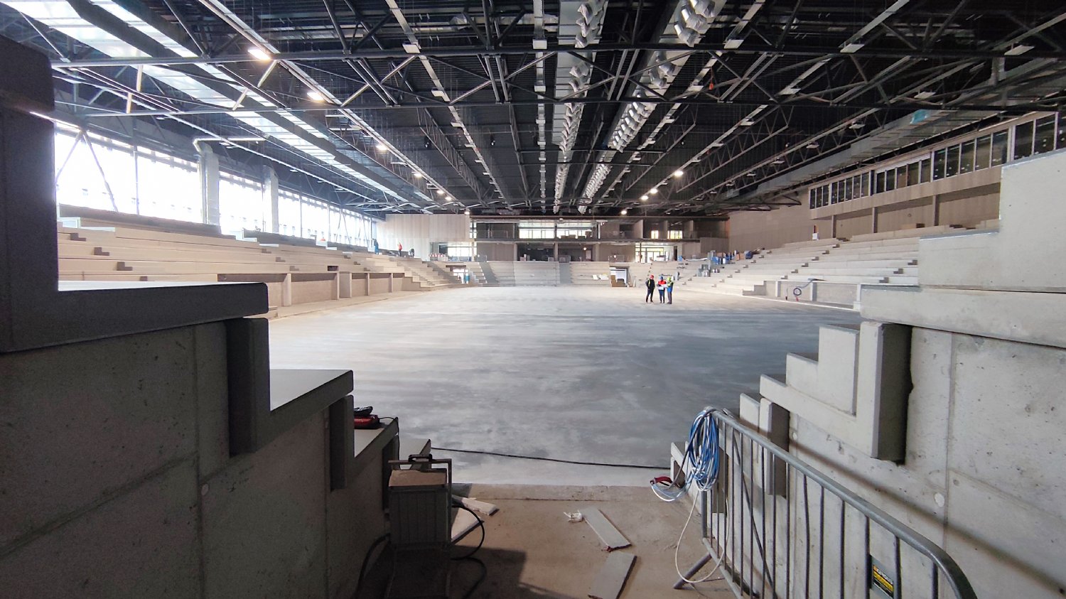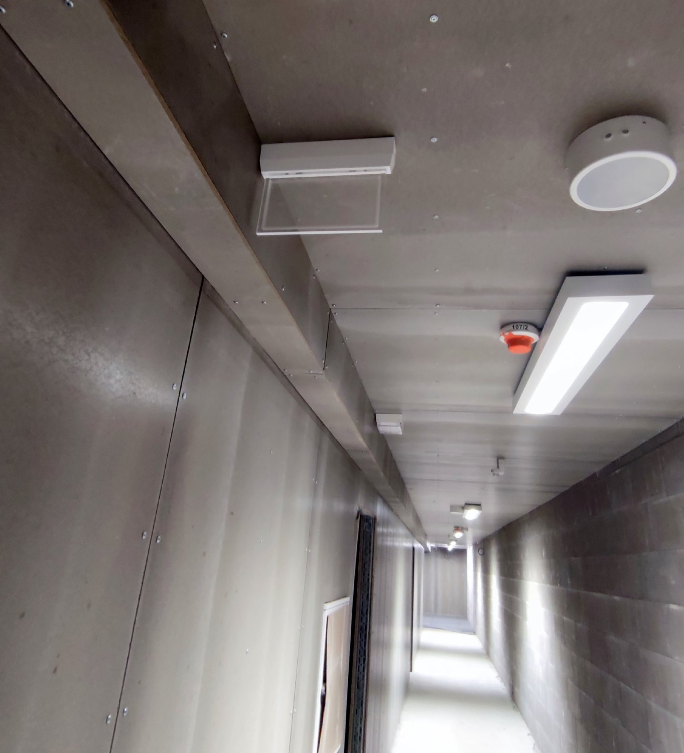 Na chodbách už je v provozu osvětlení, zapojena jsou protipožární čidla. To malé sklíčko to je orientační systém. Na něm budou zobrazeny různé světelné symboly usnadňující pohyb po stadionu