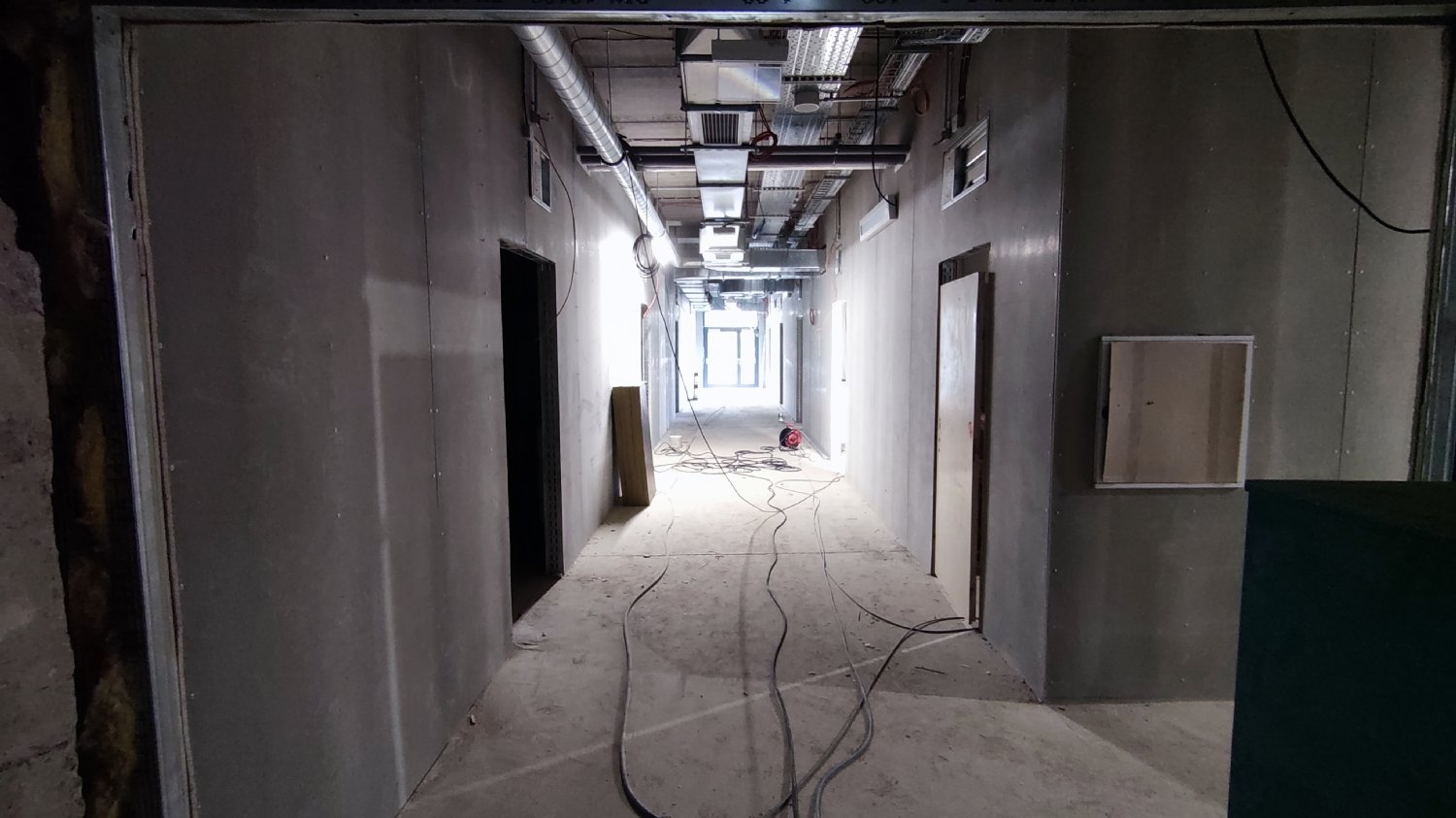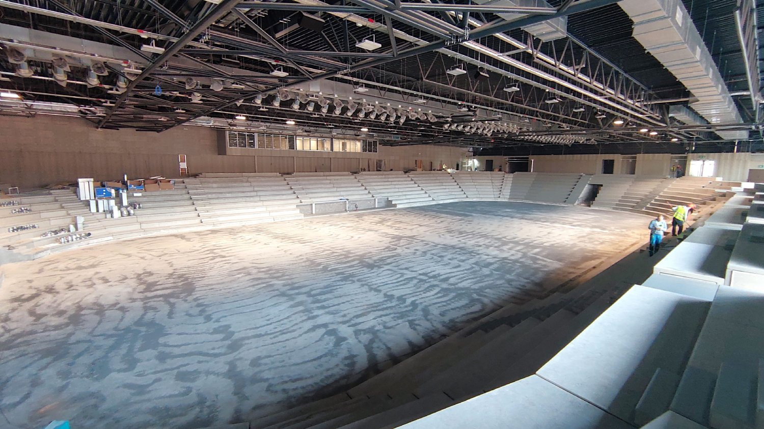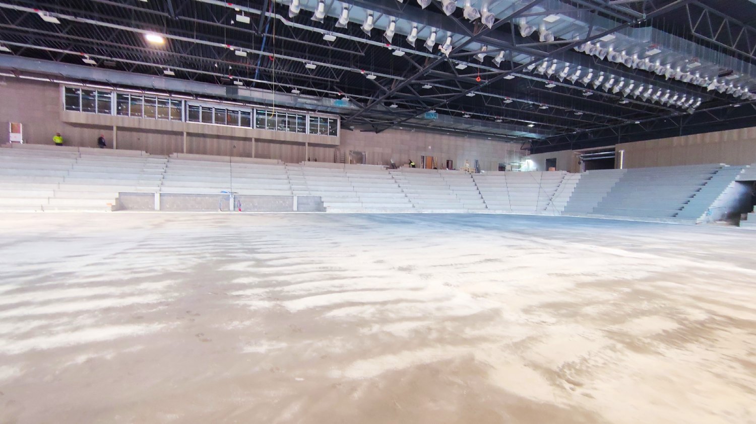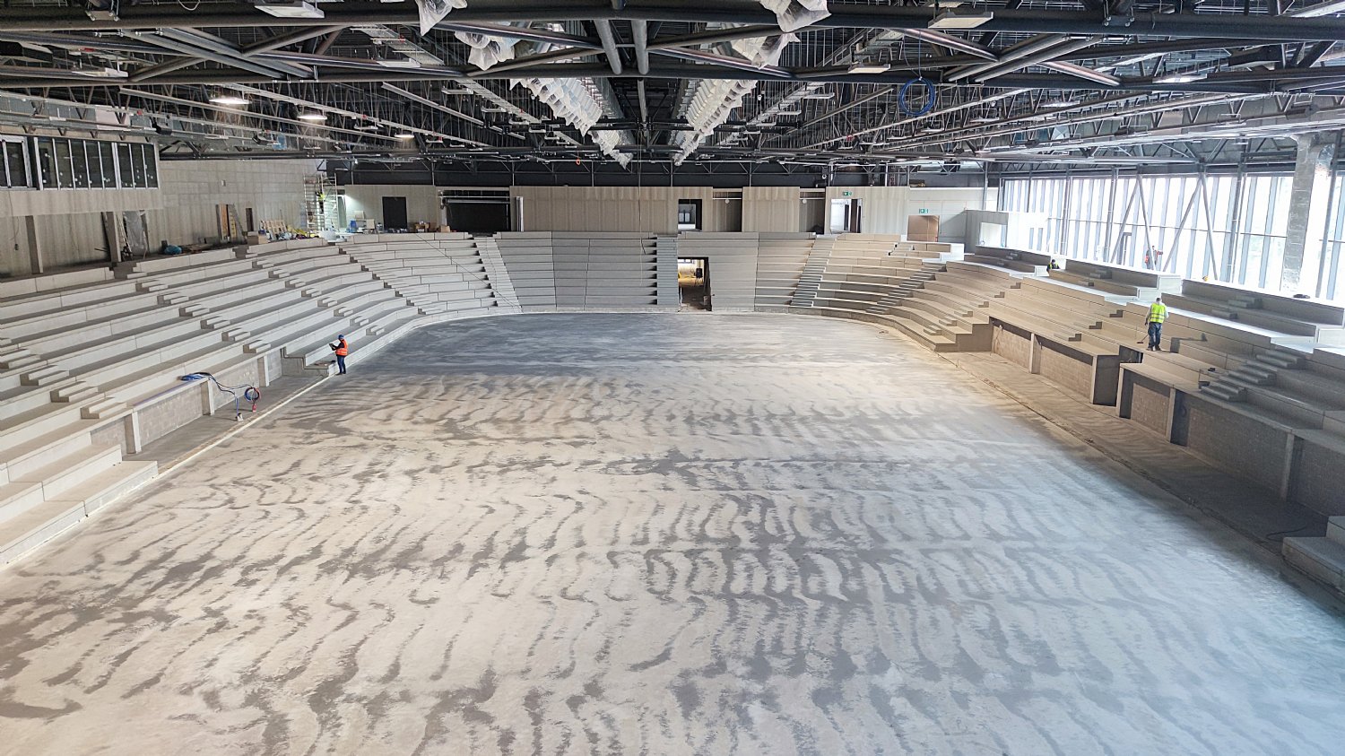 Na chodbách už je v provozu osvětlení, zapojena jsou protipožární čidla. To malé sklíčko to je orientační systém. Na něm budou zobrazeny různé světelné symboly usnadňující pohyb po stadionu