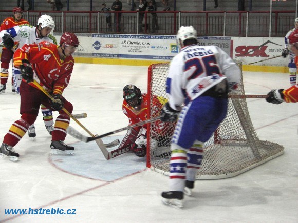 FOTO 27: Jedna ze situací v obranném pásmu Třebíče. Před bránou hlídkuje Lukáš Sláma, na bully Petr Zahradník.