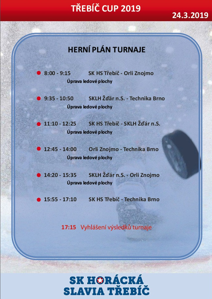 První zápas mezi SK HS Třebíč a Orli Znojmo je plánován od 08:00 do 09:15. Závěrečné utkání turnaje mezi SK HS Třebíč a Technikou Brno začne v 15:55 a skončí v 17:10. V 17:15 je naplánováno slavnostní vyhlášení výsledků turnaje.