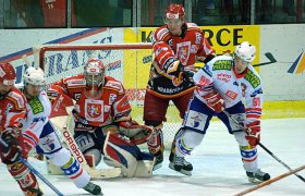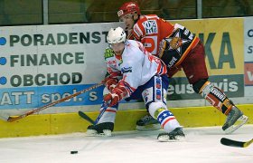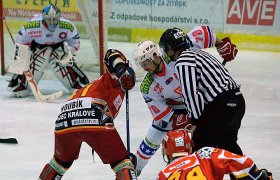 První střelou se prezentoval Vondráček, pálil však nad. Koutský poté vyrazil Zahradníkovu střelu, když mu nezištně přihrál před branku Čech. Po chybě třebíčského obránce měl tutovku Šeda, Luňák ho však vychytal. Hosté ale přeci jen udeřili. Koudelka našel na druhé straně zcela osamoceného Sakrajdu a ten prostřelil Luňáka, který se nestihl přemístit – 0:1. Vyrovnat mohl Přibyl, když mířil do protisměru hostujícího brankáře, branku však těsně minul. Naopak další branka Královéhradeckých visela na vlásku. Šeda pálil z otočky, Luňák však v leže čaroval a vyrazil střelu první, i následnou dorážku. Nedosáhl ale na nešťastný vlastní gól. Nejprve upadl za brankou jeden z domácích obránců a tímto přenechal puk Koudelkovi, ten ho vyslal před branku, kde si ho srazil přesně třebíčský hráč – 0:2. Královéhradečtí i nadále tlačili, Karlíček pálil od modré – jeho ránu zastavil Luňák lapačkou, neprostřelil ho ani Táborský. Třebíčští ale nechtěli darovat body lacino a jejich šance také volali po gólu. Nejprve zblízka minul Matušík po přihrávce Oliveriuse, pěknou individuální akcí se blýskl Martin Čech, branku však v pádu minul. Ani Dolníček neuspěl, byť měl šanci ideální – ocitl se tváří v tvář Koutskému, ale neprostřelil ho. Posledním střelcem třetiny byl Pazdera – Luňák neviděl, ale vyrazil.Na začátku druhé třetiny převzali otěže zápasu domácí. První šanci měli sice hosté, když se Haluza řítil na Luňáka – jelikož ale branku minul, potvrdilo se otřepané pravidlo nedáš – dostaneš. Matušík našel před brankou Oliveriuse a ten prostřelil jemnou tečí se štěstím Koutského – 1:2. Zanedlouho bylo vyrovnáno. Třebíčští využili přesilovou hru v čase 28:32. Tomáš Kolafa se prezentoval třemi kličkami ve středním pásmu, přihrál volnému Oliveriusovi, ten mu puk vrátil před branku a třebíčský bek jen usměrnil kotouč – 2:2. Královéhradečtí se s tím nechtěli smířit, před branku domácích se tlačil Roubík, na Luňáka však nevyzrál. Pár chvil pozornosti přítomných diváků získal Matušík, když mířil nejprve bekhendem nad, poté si sjel na přihrávku na střed, zcela osamocen si položil Koutského a objel ho, vystřelil na prázdnou branku, kde ale zasáhl hostující obránce. Jeho další dorážka pak mířila těsně vedle… Několik spálených šancí a staré známé pravidlo – 2:3. Nejprve sice spálil tutovku Vondráček, když ho vychytal Luňák, poté ale lehce dorazil odražený puk Haluza a rázem hosté znovu vedli. Jelikož poté Haluza v další šanci neprostřelil Luňáka, nikdo se už ničemu nedivil – Třebíčští využili další přesilovou hru – Oliverius si přiťukl kotouč s Lukášem Slámou a střelou pod břevno rozsvítil červené světlo za královéhradeckou brankou – 3:3. Poté pálil Domin z mezikruží, třebíčský brankář však vyrazil, stejně jako střelu Toužimského. Hosté se ale opět dostávají do vedení, když nabídnutou dvojnásobnou přesilovou hru trestají – Táborský vystřelil a Vondráček lehce dorazil – 3:4. Prakticky ihned bylo vyrovnáno. V oslabení ujela dvojice Matušík – Oliverius, prvně jmenovaný volil střelu a mířil přesně mezi nohy Koutského – 4:4.